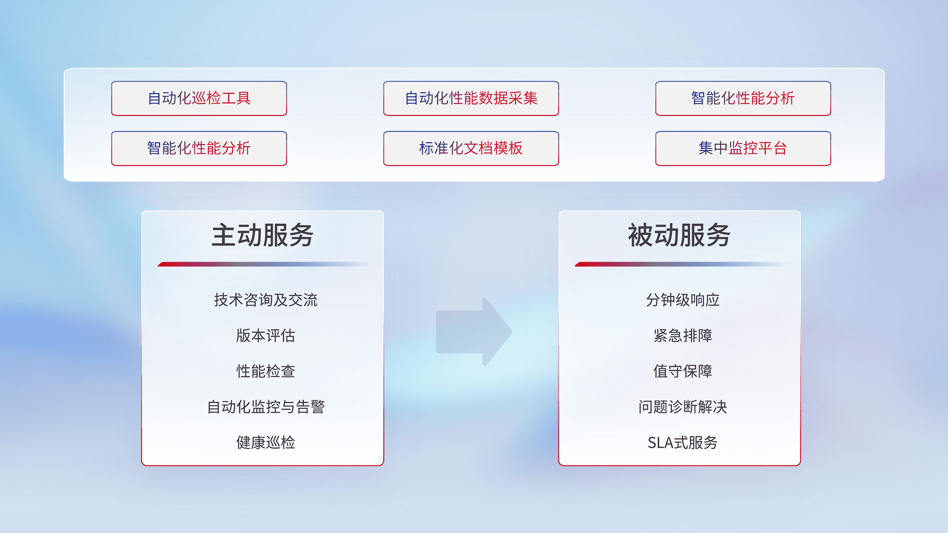 智能化工具和标准化文档,,,,保障服务质量,,提供主动服务(包含技术咨询、、版本评估、、、、性能检查、、自动化监控与告警、、健康巡检)和被动服务包含(分钟级响应、、紧急排障、、值守保障、、、、问题诊断解决、、SLA服务)。。。。